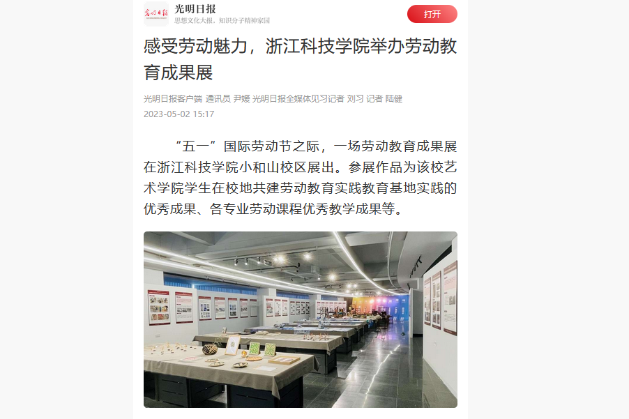 “五一”国际劳动节之际,一场劳动教育成果展在浙江科技学院小和山校区展出。参展作品为该校艺术学院学生在校地共建劳动教育实践教育基地实践的优秀成果、各专业劳动课程优秀教学成果等。