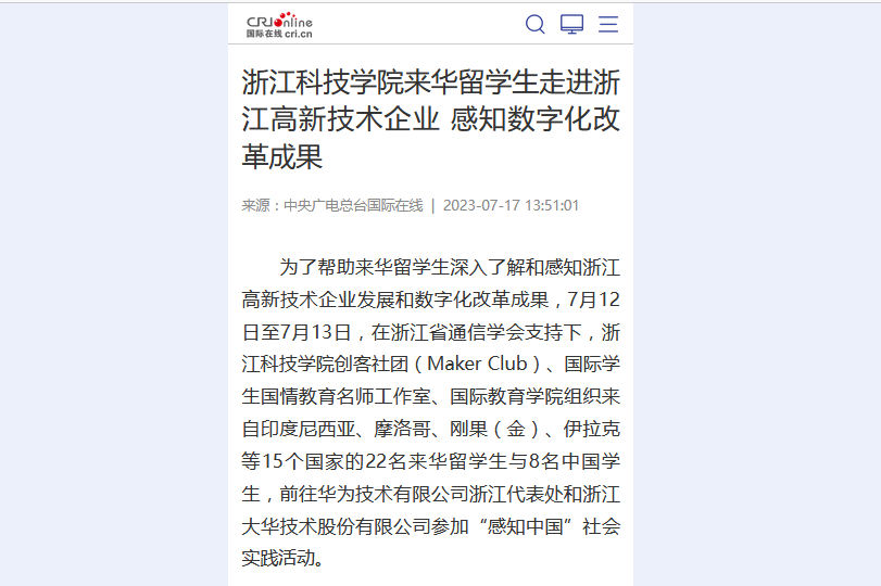 7月12-13日,在浙江省通信学会支持下,我校创客社团(Maker Club)、国际学生国情教育名师工作室、国际教育学院组织来自印度尼西亚、摩洛哥、刚果(金)、伊拉克等15个国家的22名来华留学生与8名中国学生,共同赴华为技术有限公司和浙江大华技术股份有限公司,深入了解和感知浙江高新技术企业发展和数字化改革成果。国际在线、橙市互动等媒体对改活动进行了报道。