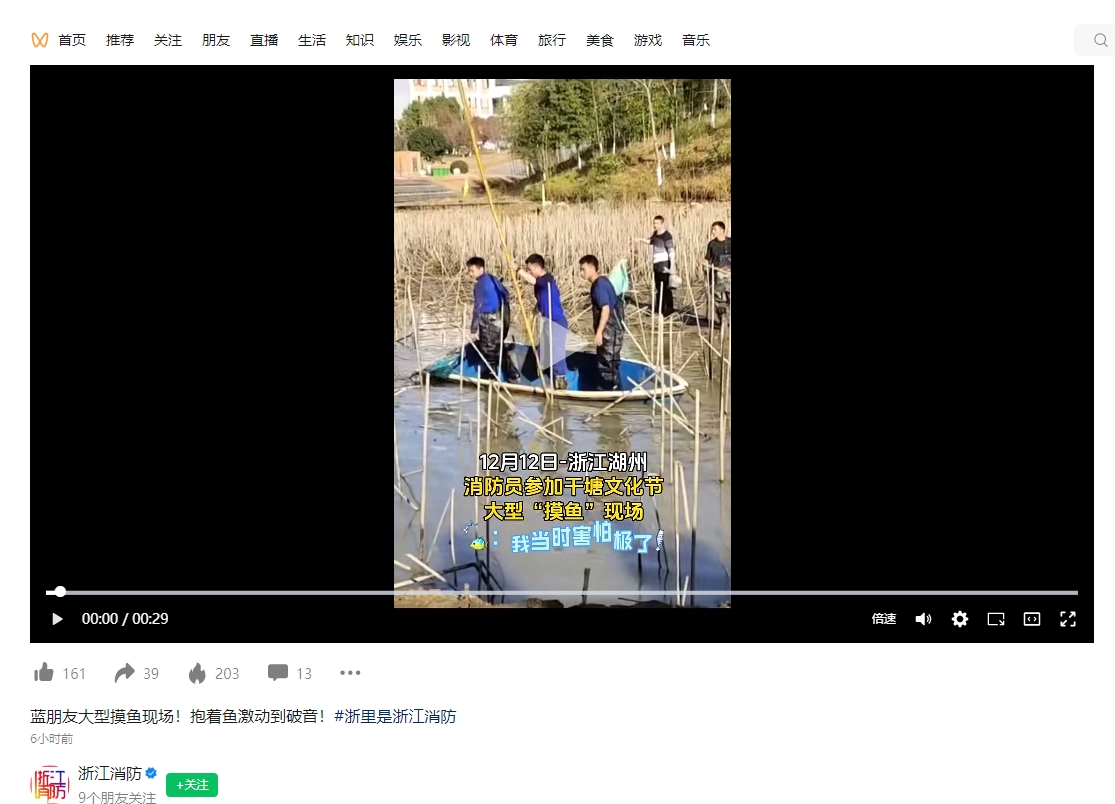 近日,浙江科技学院安吉校区抽干校内部分池塘的水,让师生尽情享受丰收的喜悦!最安吉、浙江消防视频号等对活动进行了报道。