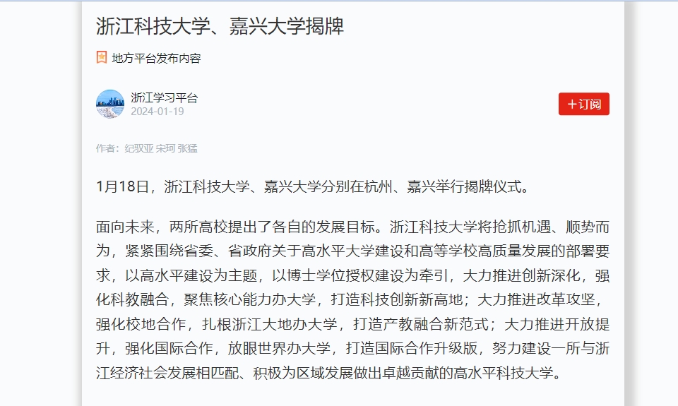 嘉兴大学则提出,将不断推进红船精神育人特色再深化、应用办学优势再强化,奋力在建设有特色、善创新的一流应用型综合性大学上积极探索;将坚持国家所需、区域所盼、学校所能,充分发挥长三角一体化的区位优势,融入教育、科技、人才一体推进布局,奋力在落实高教强省战略、推进建设高水平大学上先行示范;将聚焦嘉兴加快打造长三角城市群重要中心城市的发展要求,深入实施科技创新驱动、新型智库赋能、教育对外开放等专项行动,奋力在服务地方经济社会高质量发展、办好人民满意的大学上走在前列。在嘉兴大学的揭牌仪式上,嘉兴大学与北京理工大学、浙江清华长三角研究院签订合作协议。嘉兴大学还成立了发展战略专家委员会,首批聘任8名院士为专家委员会委员。