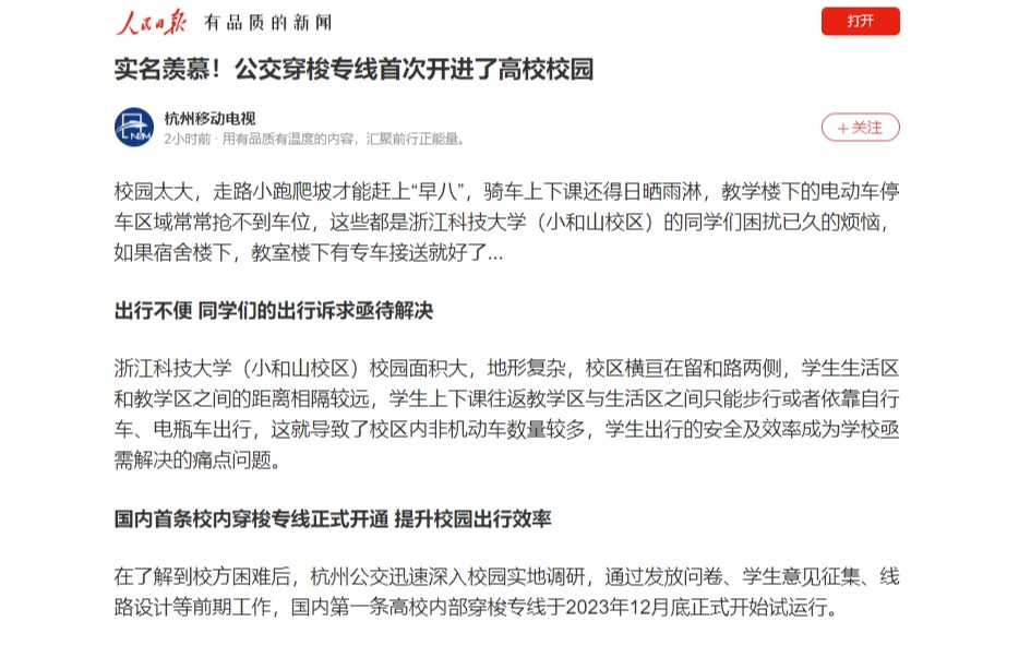 人民日报客户端:实名羡慕!公交穿梭专线首次开进了高校校园
