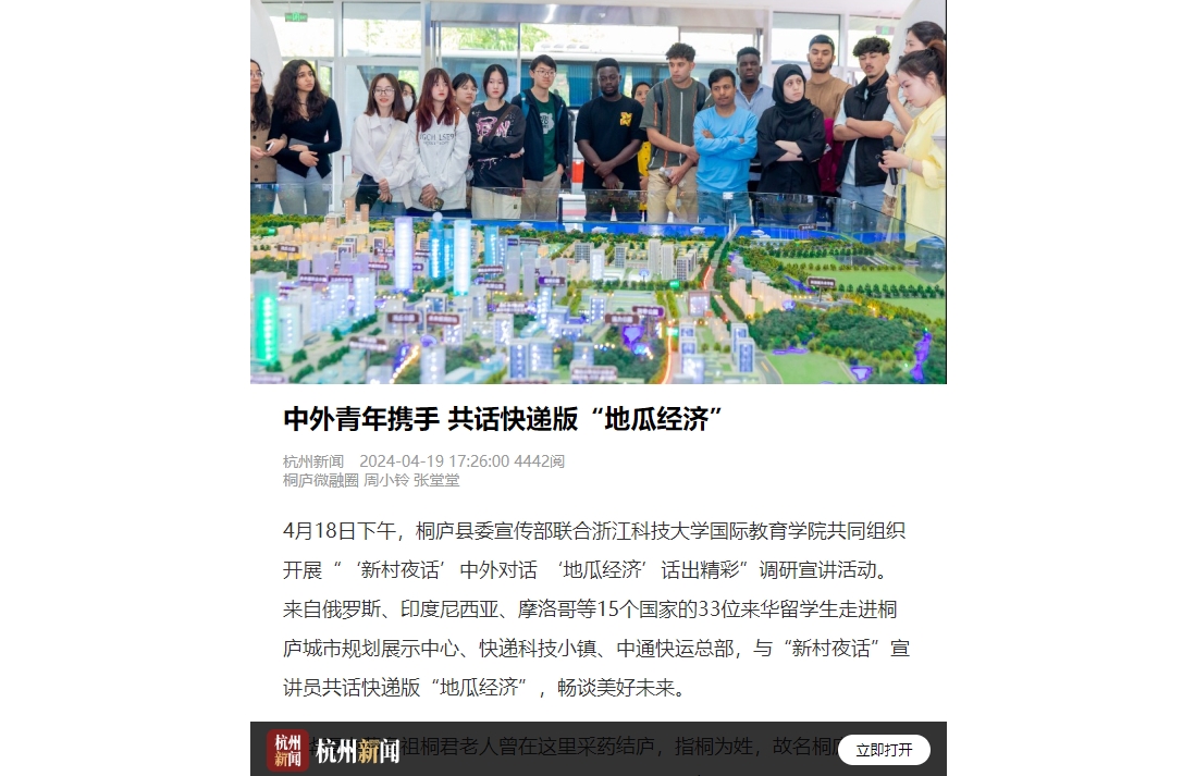 4月18日下午,桐庐县委宣传部联合久久精品一区二区|久久久一区二区三区|欧美日韩视频|欧美福利视频|高清欧美性猛交xxxx黑人猛交|久久久www成人免费精品|在线观看成人网站国际教育学院共同组织开展“‘新村夜话’中外对话 ‘地瓜经济’话出精彩”调研宣讲活动。来自俄罗斯、印度尼西亚、摩洛哥等15个国家的33位来华留学生走进桐庐城市规划展示中心、快递科技小镇、中通快运总部,与“新村夜话”宣讲员共话快递版“地瓜经济”,畅谈美好未来。