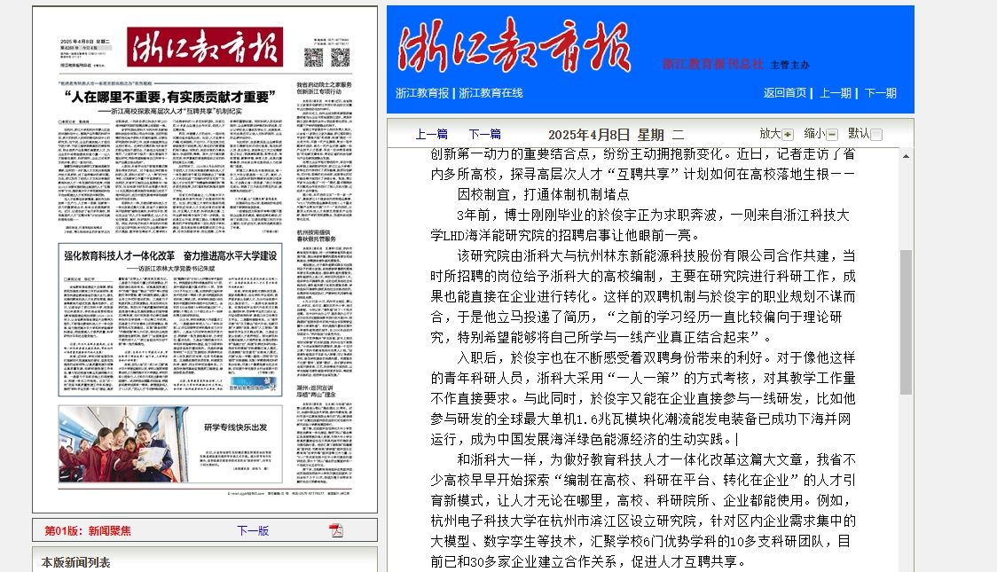 和浙科大一样,为做好教育科技人才一体化改革这篇大文章,我省不少高校早早开始探索“编制在高校、科研在平台、转化在企业”的人才引育新模式,让人才无论在哪里,高校、科研院所、企业都能使用。例如,杭州电子科技大学在杭州市滨江区设立研究院,针对区内企业需求集中的大模型、数字孪生等技术,汇聚学校6门优势学科的10多支科研团队,目前已和30多家企业建立合作关系,促进人才互聘共享。