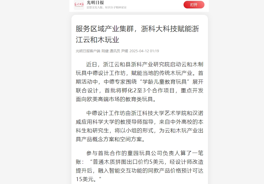 “我们要让高校智力资源直接对接产业需求,”云和浙科产业研究院负责人说,此前研究院组织教师积极对接政府以及多家木玩企业需求。中德设计工作坊以“设计无界·智创未来”为主题,旨在打造一个国际化设计交流平台,将通过定期举办中德设计工作营、企业技术对接会,推动建立“联合工业设计研发中心”,串联“产业集群—高校研发—国际设计”资源,让“中国木玩童话”以创新设计续写新篇章。