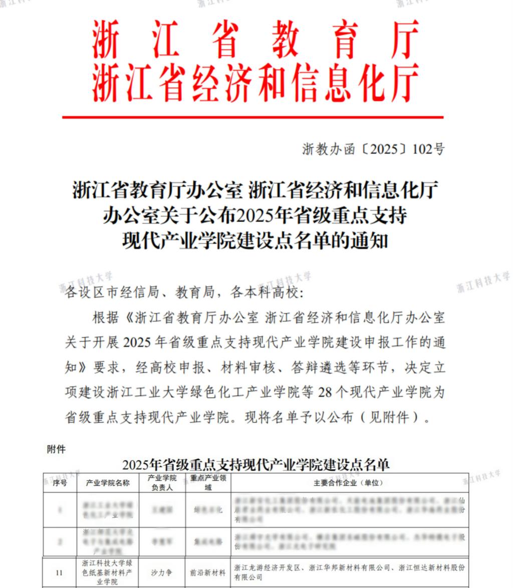 近日,浙江省教育厅办公室、浙江省经济和信息化厅办公室联合发布《关于公布2025年省级重点支持现代产业学院建设点名单的通知》,我校绿色纸基新材料产业学院获批立项省级重点支持现代产业学院建设点。