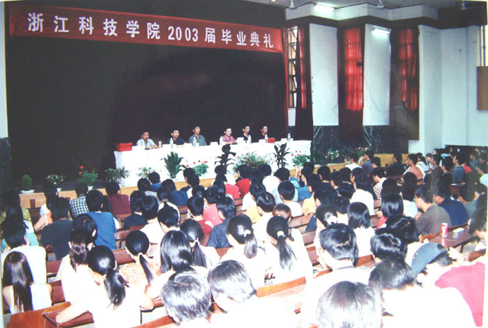 6月16日上午,我校在演播厅隆重举行了2003届学生毕业典礼,99级669名毕业生、各系领导及有关部门负责人参加了毕业典礼。院党委书记、副院长金光远,院长沈莲清教授,院党委副书记胡浙平,副院长龚建立教授等在主席台就坐。毕业典礼由院党委副书记胡浙平主持。